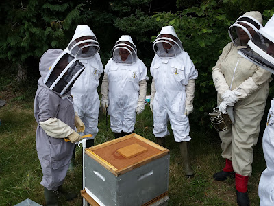 Once we'd retreated and were taking off our suits, we were shown all of the little black stings in our suits. At that point, two bees came back and stung Kevin the beekeeper! He said that often happens. Kevin and I are rethinking our secret urge to keep bees. We already have many bees on our land, and they seem quite happy not to have human hive-keepers.